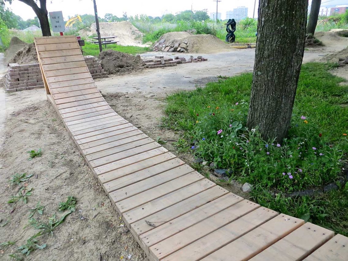 A homeowner next to the four-lot property adjoining his home used to watch drug deals from his window, and see dealers duck into the thicket of weeds, brush and trees that had grown up next to his property. He watched Gall and friends fill numerous garbage bags with rubble and trash. Two weeks later, social networks and word-of-mouth brought 100 people to help clean-up the site, Brush Park neighbors included. They dug out garbage and shaped riding trails, painted the derelict playground equipment and incorporated it into ramps, slopes and turns. One neighbor was seen nightly mowing the lot.