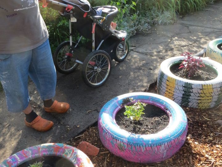 Included in the NBB patchwork is an edible playscape and a flower lot bursting with a variety of wildflowers. Five adjoining vacant lots include an orchard, green house and community garden. There is a water wall, earth walls and a rain catch system for collecting water for the gardens; gardens with plants that attract birds and butterflies and clover patches, which add nitrogen to the soil and discourage weed growth. There is a lot that has been turned into a gathering place for children; an outdoor stage for music performances and festivals; a pocket park; a permaculture garden and colorful murals.