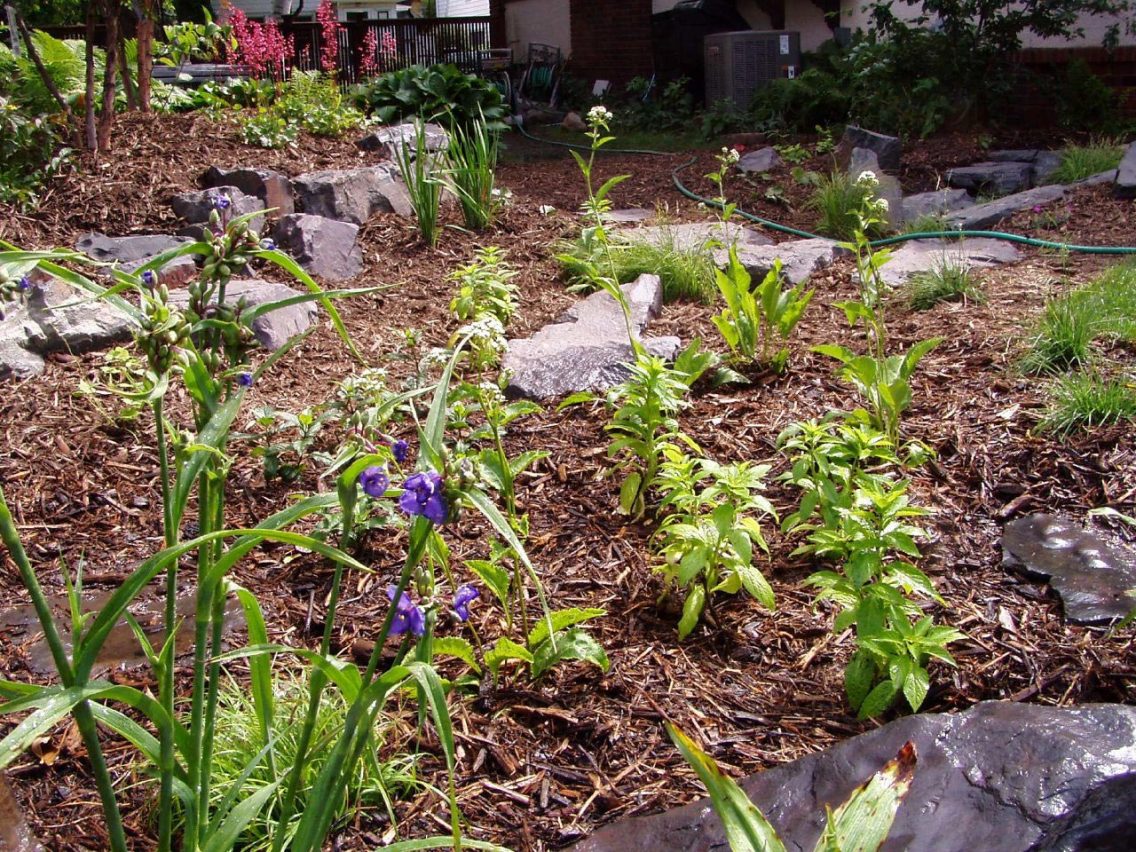 Easy-to-build side lot rain garden designed with plants commonly available at local shops and national chains.