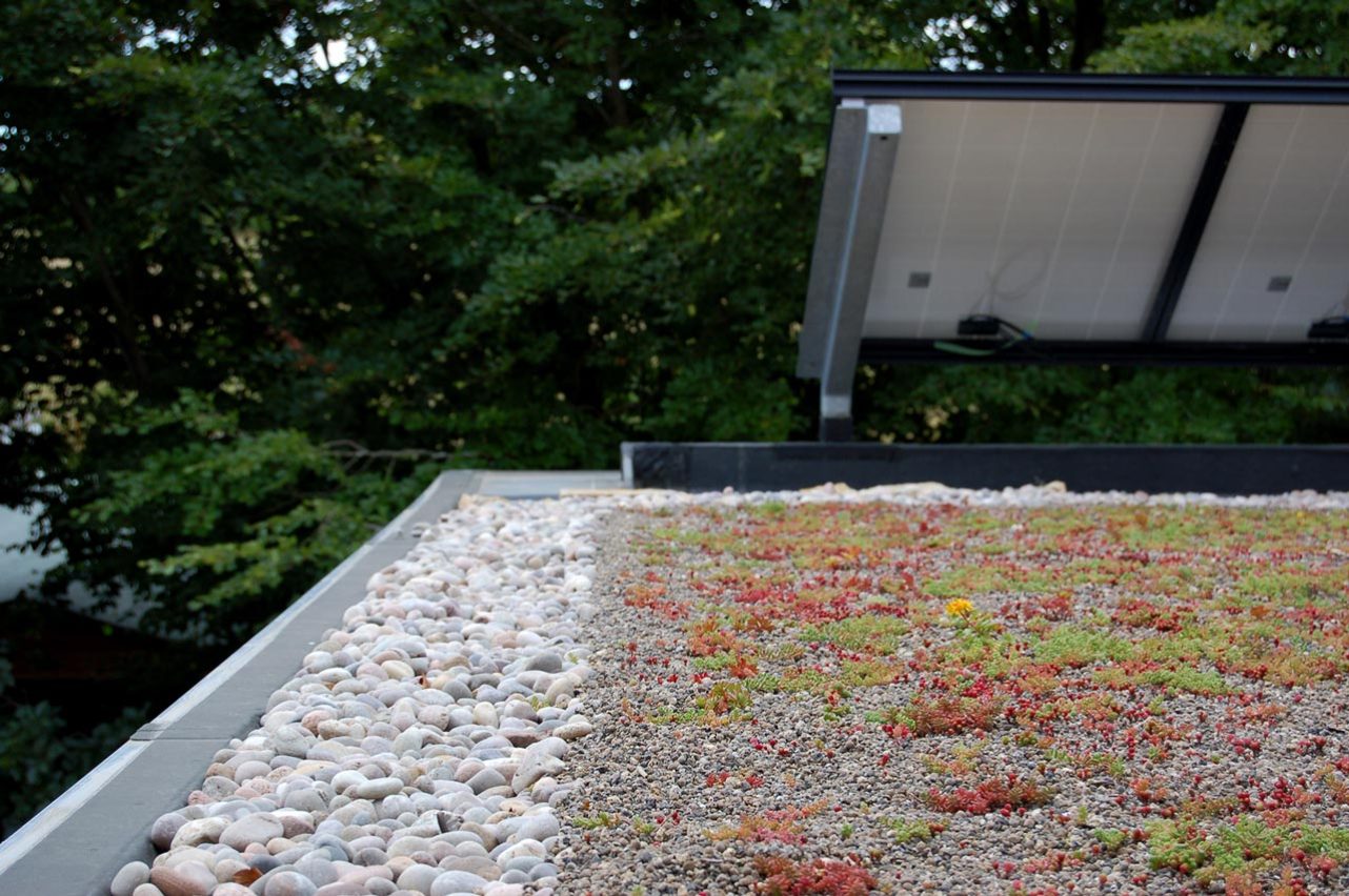 The Gravel Garden provides many of the benefits that a green roof can, including an enhanced ability to manage stormwater through the soil, gravel and succulents that are part of this lot design, while beautifying, reducing maintenance and creating habitat for pollinators.